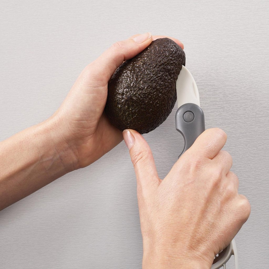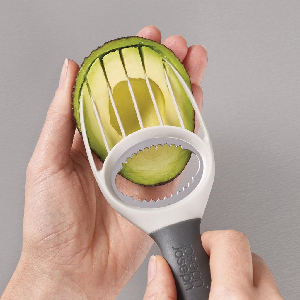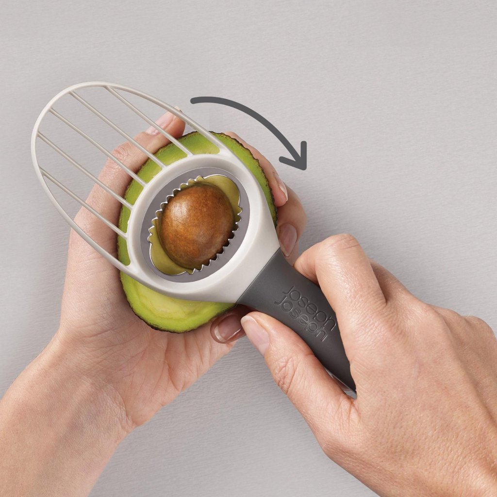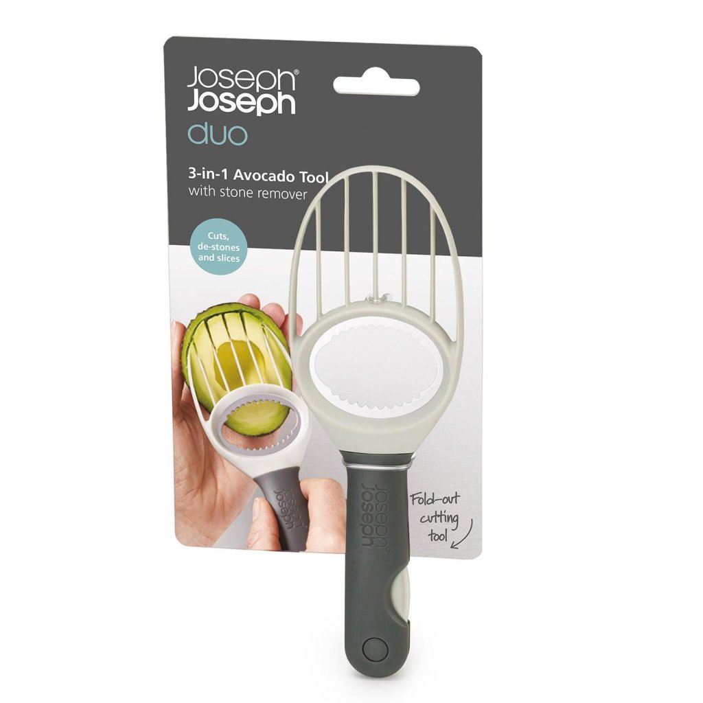 - Praktiskais avokado griezējs Joseph Joseph DUO ļauj ērti un droši nomizot, izņemt kauliņu, izgriezt un sagriezt avokado šķēlītēs, izmantojot vienu kompaktu rīku.