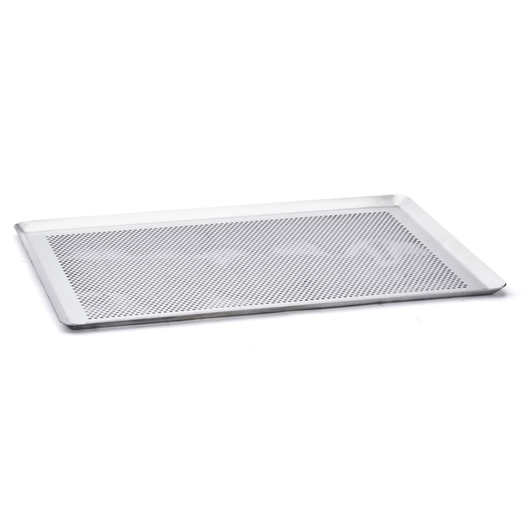 - Mikroperforēta alumīnija loksne de Buyer ar slīpētām malām ir paredzēta mazu konditorejas izstrādājumu un konditorejas izstrādājumu vienmērīgai cepšanai.