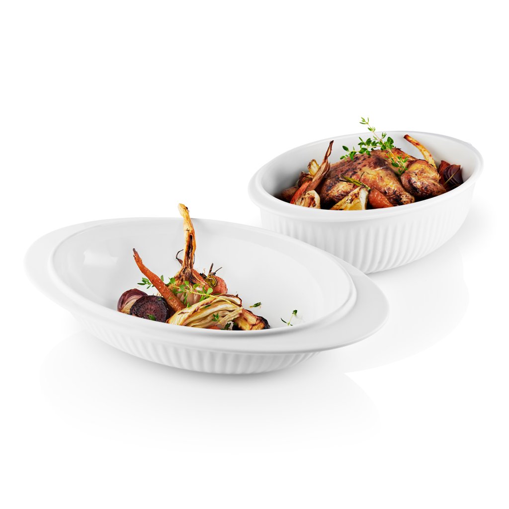 Dāņu zīmola Eva Solo ovāls cepamais trauks / cepamā panna Legio Nova baltā krāsā ar rievotu apdari būs jūsu uzticamais virtuves palīgs. Materiāls ir tik izturīgs, ka bļodu no ledusskapja var likt tieši cepeškrāsnī vai zem grila. Plakanie sānu rokturi nodrošina ērtu un drošu lietošanu.