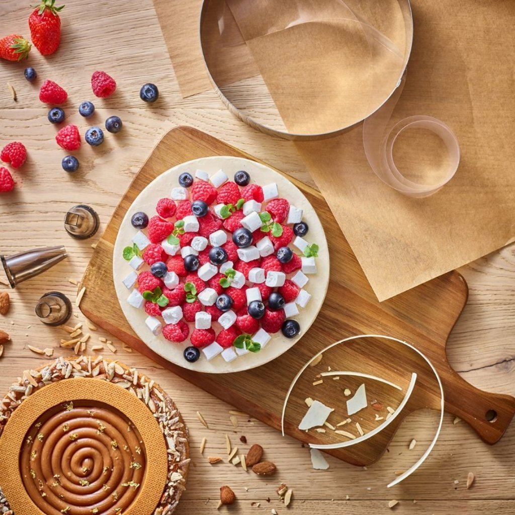 - ideāli piemērots mūsdienīgu putukrējuma desertu, kūku vai saldējuma kārumu pagatavošanai tieši uz dzesēšanas paplātes