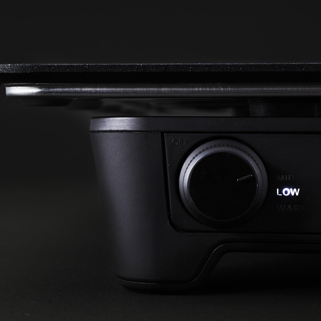 - Ar vienu pagriežamu pogu var izvēlēties vienu no četrām temperatūrām (100 °C, 150 °C, 190 °C vai 250 °C), lai pielāgotu grilu gan lēnai, gan ātrai grilēšanai.