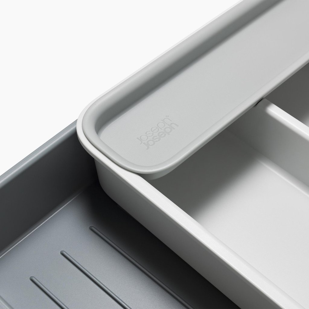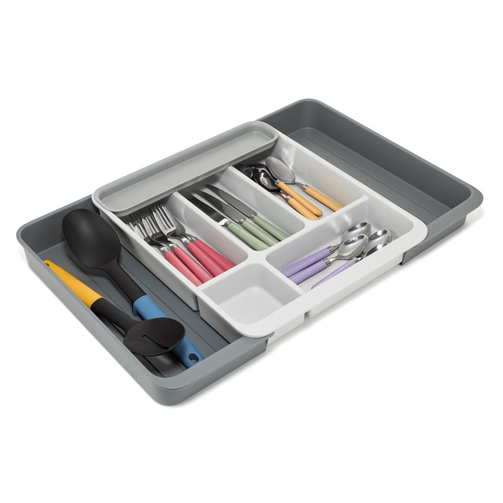 - Atvilktņu organizators Joseph Joseph DRAWERSTORE palīdz pārskatāmi sakārtot galda piederumus, virtuves piederumi un mazus instrumentus virtuves atvilktnē.