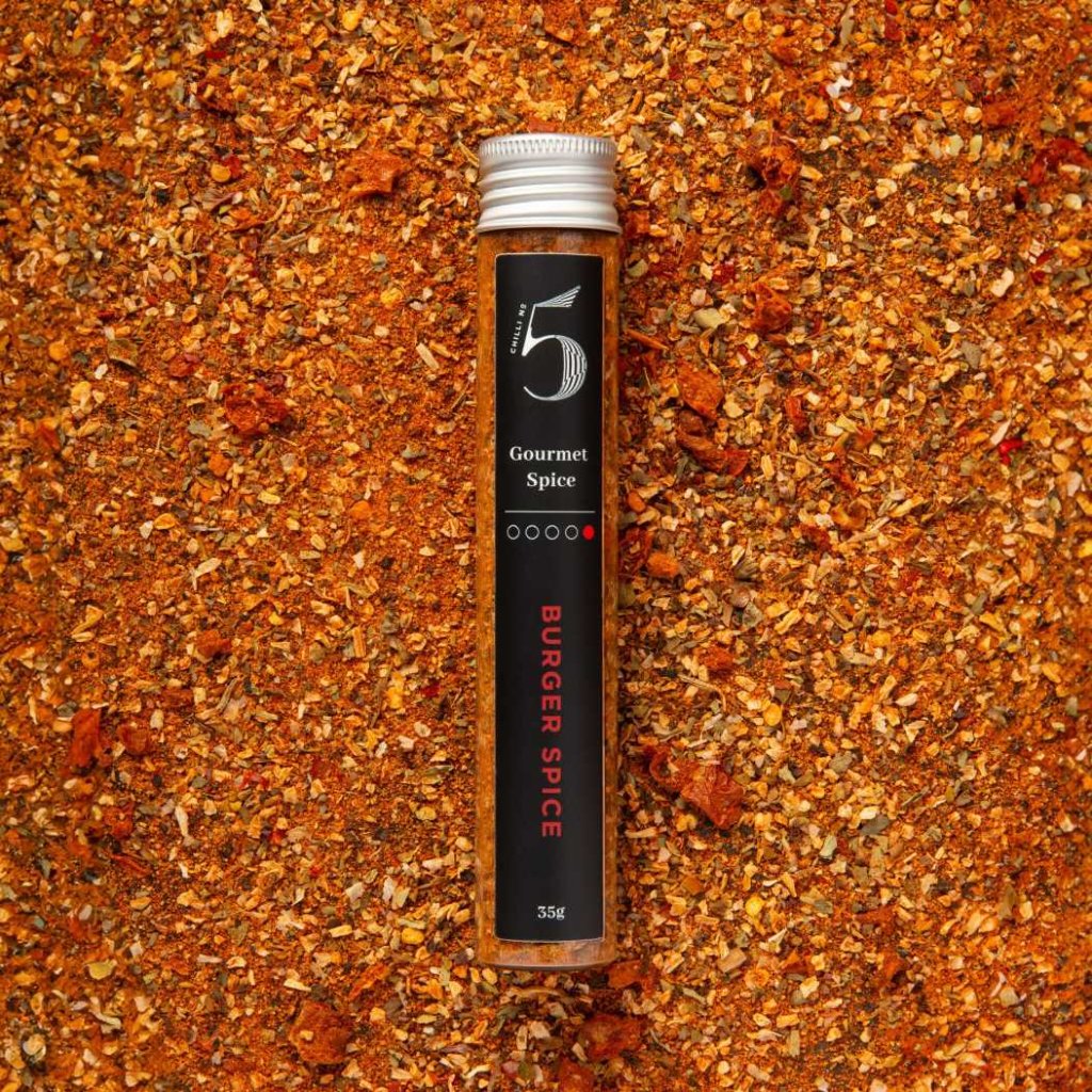 - BURGER SPICE no Chilli No5 ir gardēžu garšvielu maisījums, kas radīts spēcīgu garšu cienītājiem un pacels jūsu mājās gatavotus burgerus un citus ēdienus jaunā līmenī.