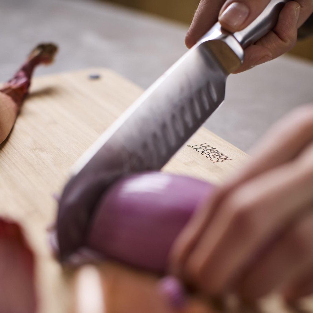 - 3 griešanas dēlīšu komplekts Joseph Joseph FOLIO ar bambusa griešanas dēlītēm piedāvā praktisku risinājumu sastāvdaļu sagatavošanai un pārskatāmai uzglabāšanai modernā statīvā, kas uztur jūsu darba virsmu sakārtotu.