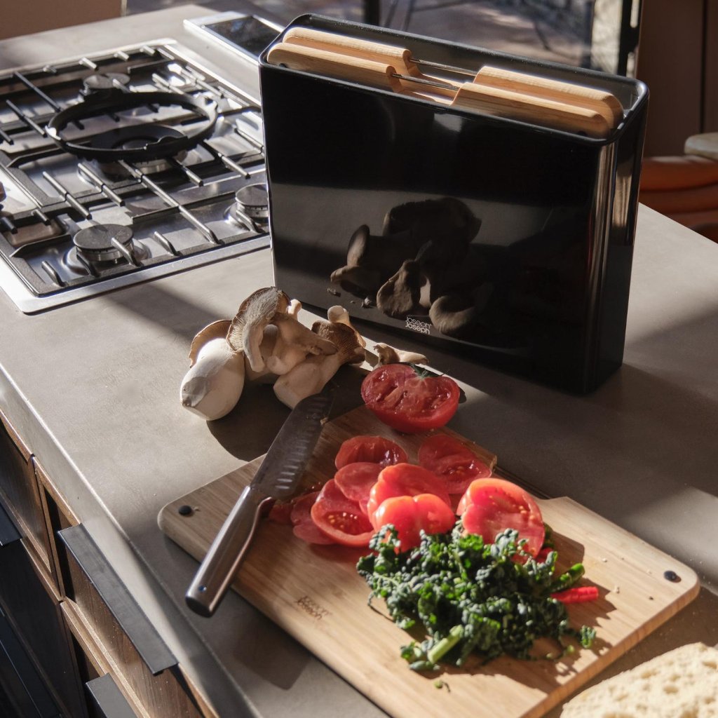 - Kompaktais vertikālais izkārtojums palīdz ietaupīt vietu uz darba virsmas, vienlaikus ļaujot griešanas dēļiem vienmēr būt gataviem lietošanai.