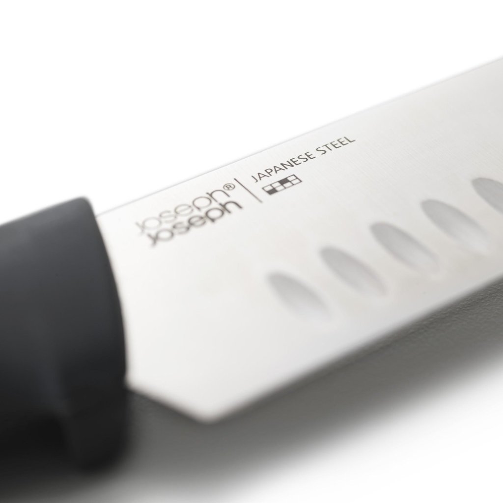 - Elevate iebūvētie balsti uz nažu rokturiem nodrošina, ka asmens atliekot paliek virs darba virsmas, tādējādi gatavošanas laikā virtuve paliek tīrāka.