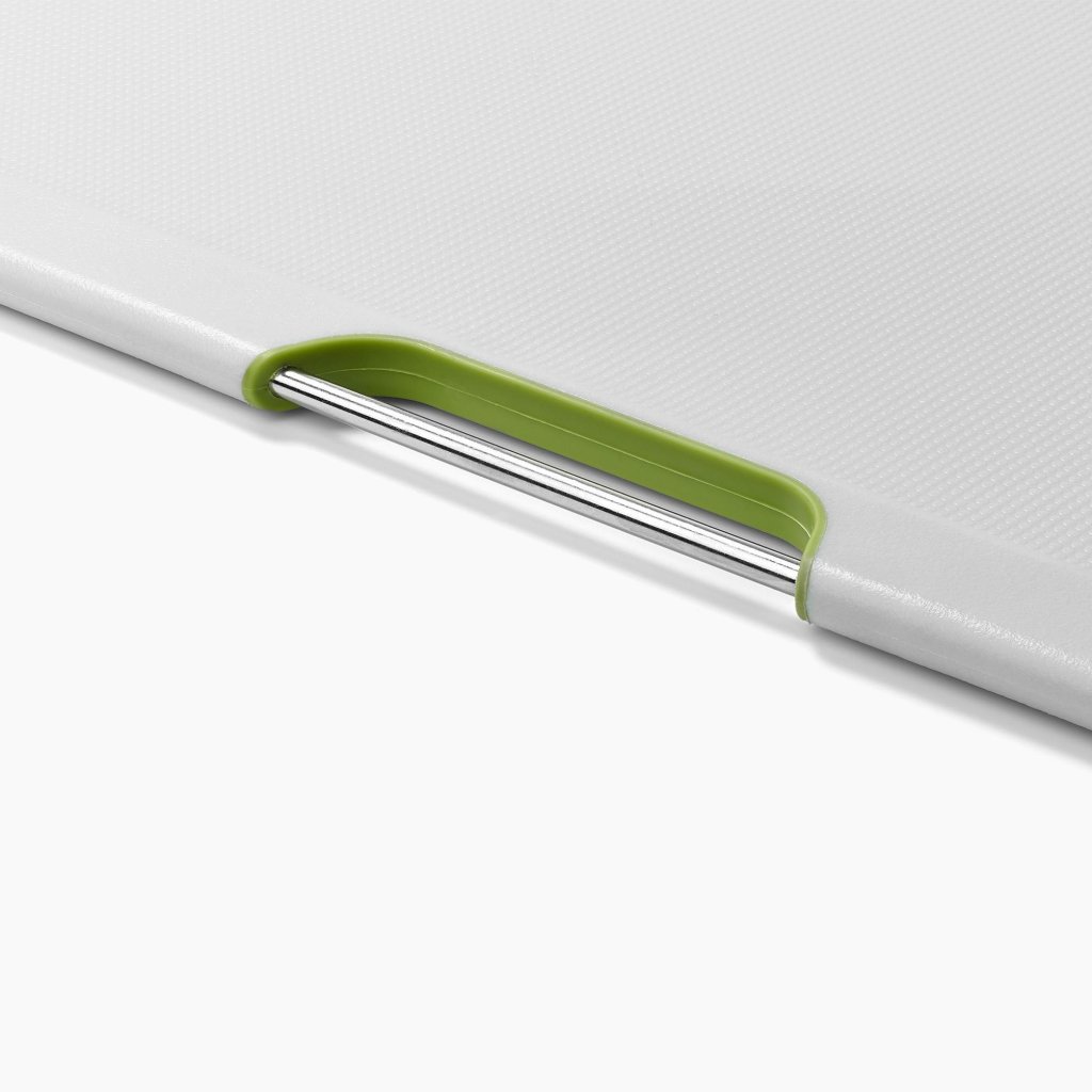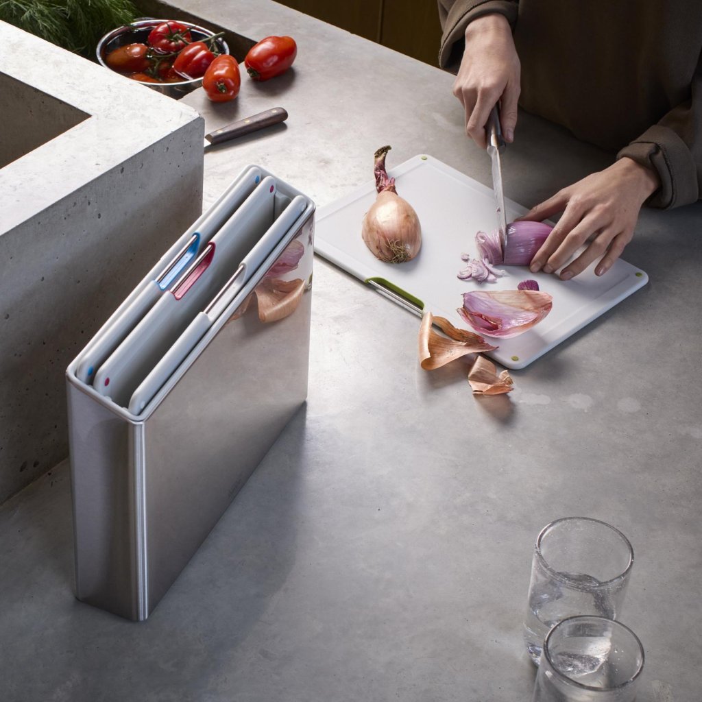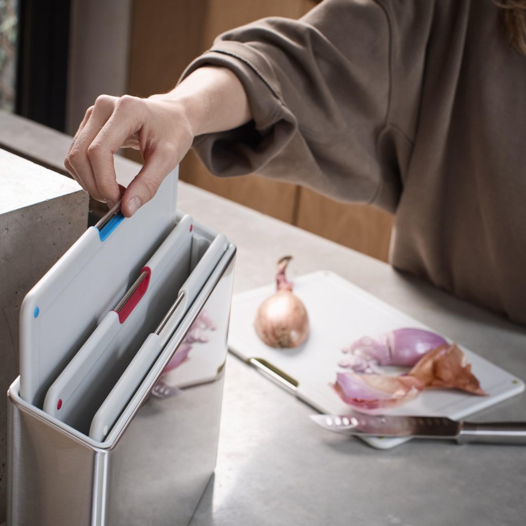 - Joseph Joseph FOLIO STEEL griešanas dēlīšu komplekts satur 4 praktiskus dēlīšus, kas uzglabāti elegantā nerūsējošā tērauda statīvā, kas palīdz uzturēt darba virsmu pārskatāmi sakārtotu ēdiena gatavošanas laikā.