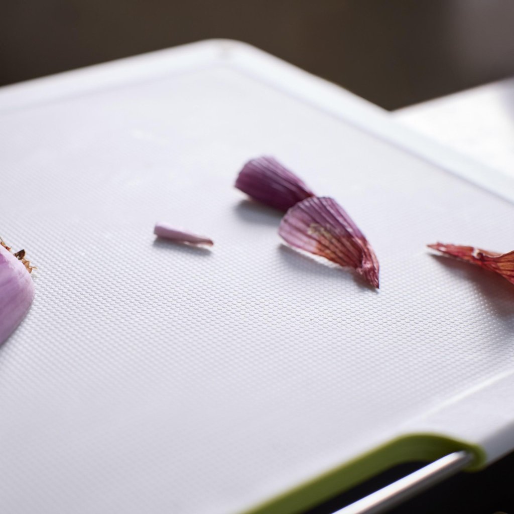 - Teksturētā dēlīšu virsma ir saudzīga pret nažu asmeņiem un vienlaikus nodrošina stabilu virsmu dažādu sastāvdaļu griešanai, smalcināšanai un porcionēšanai.