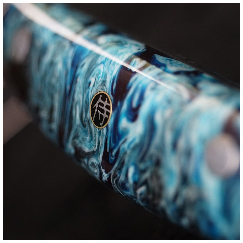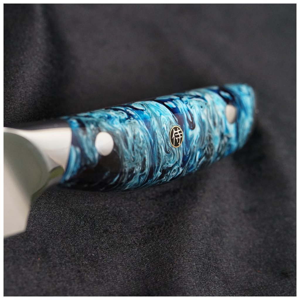 - krāsains sveķu rokturis ar trim kniedēm - centrālā kniede ar samuraja emblēmu