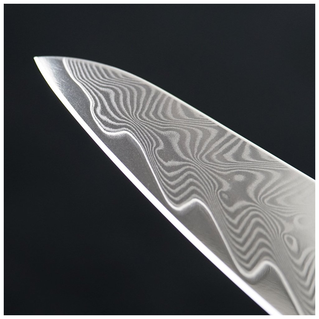 - rūpīgi slīpēts asmens ar VG10 damaska tērauda serdi un 66 nerūsējošā tērauda slāņiem, kas nodrošina izcilu izturību un izturību