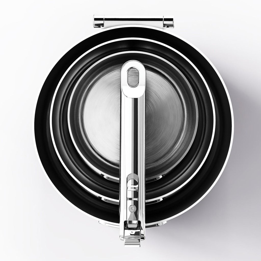 - Pateicoties salokāmajām roktīm, katlus var viegli sakraut vienu otrā, ietaupot līdz pat 50% vairāk uzglabāšanas vietas salīdzinājumā ar parastajiem traukiem.