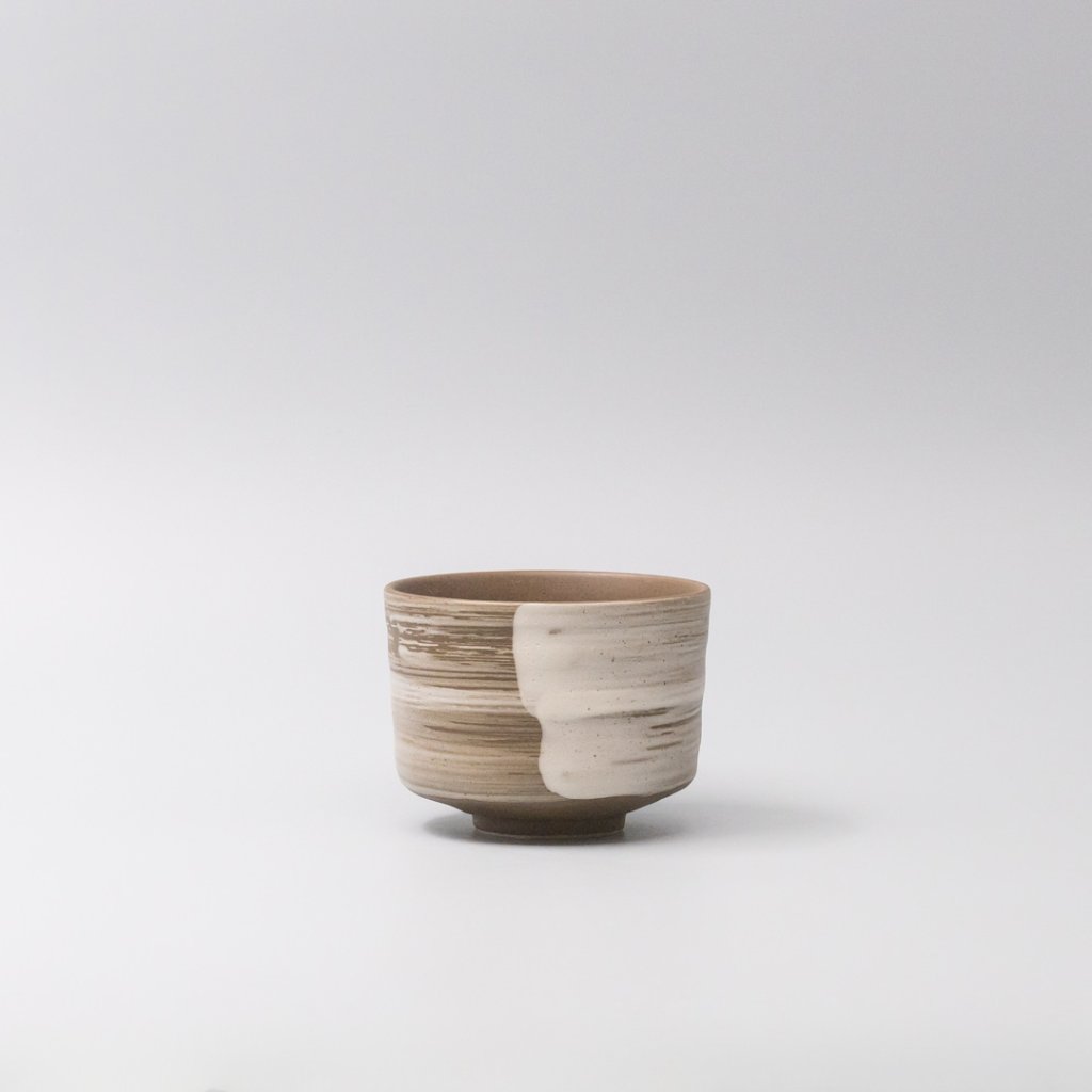 - Zemes brūnā virsma ar izteiktu baltu glazūras triepienu rada kontrastējošu efektu un piešķir tējas rituālam atšķirīgu vizuālo momentu.