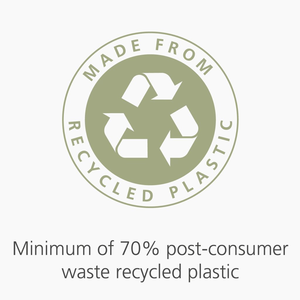 - Īpašā konstrukcija ir izgatavota no vismaz 70% pārstrādātas plastmasas no patērētāju atkritumiem, kas palīdz samazināt jaunas plastmasas daudzumu.