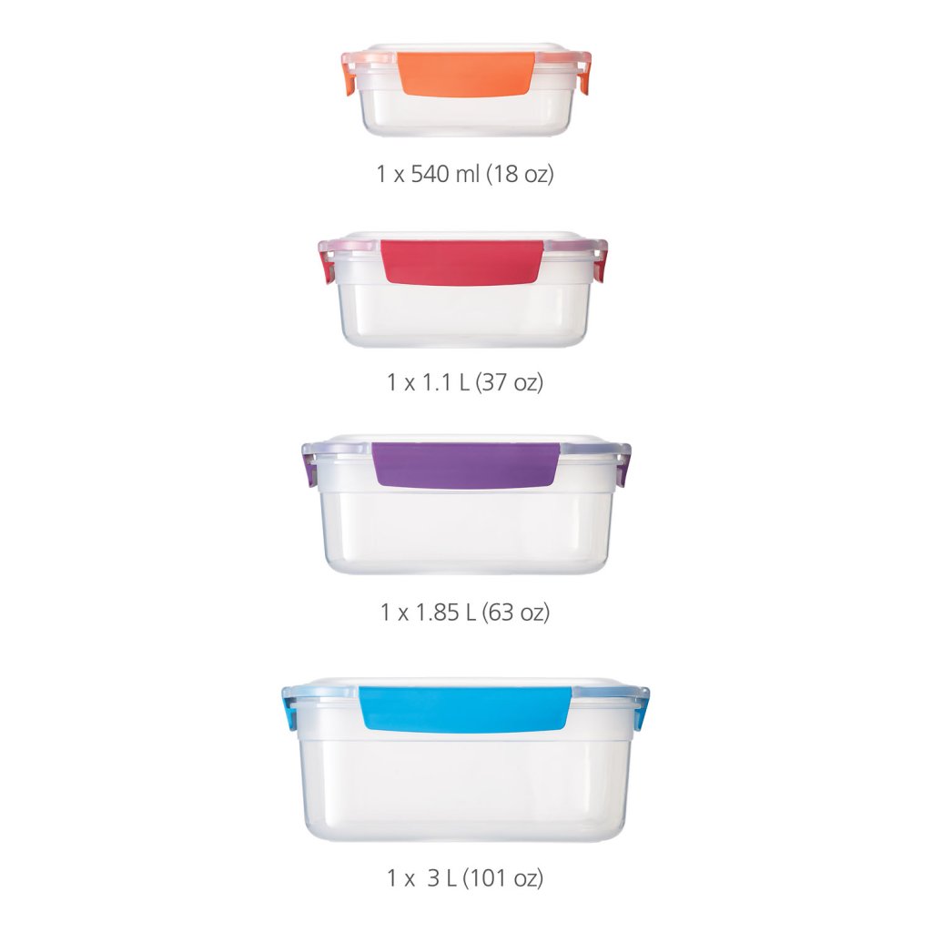 Vai esat kādreiz vēlējies iepakot ēdienu līdzņemšanai, bet nevarējāt atrast piemērotu konteinera vāciņu? Programmā Joseph Joseph šī problēma ir atrisināta. Visus šī komplekta traukus, tostarp vākus, var viegli sakraut vienu uz otra. Turklāt gan tvertnēm, gan vākiem vienmēr ir pārkrāsotas krāsas, tāpēc pareizās krāsas pievienošana ir dažu sekunžu jautājums. Komplektā ir četri plastmasas trauki, kurus var izmantot mikroviļņu krāsnī un mazgāt trauku mazgājamā mašīnā.