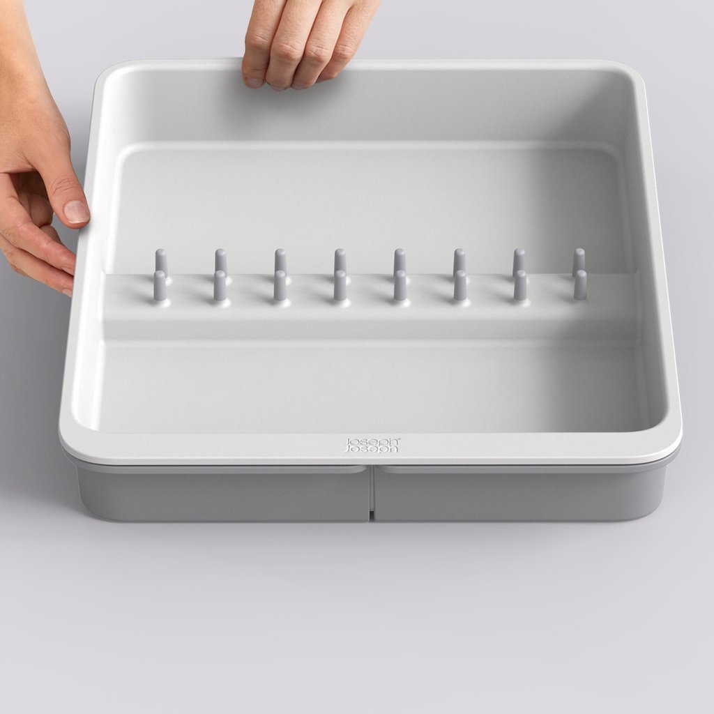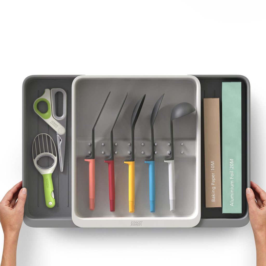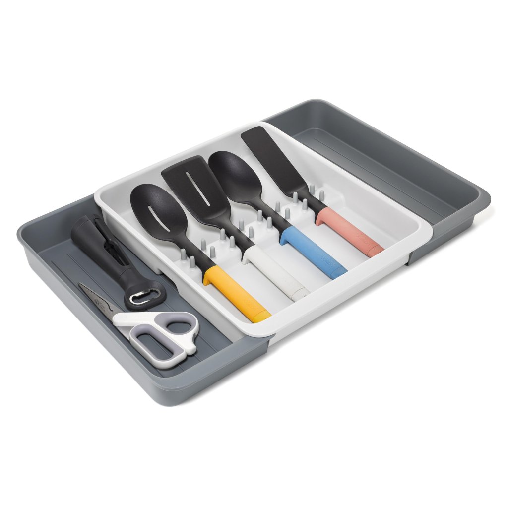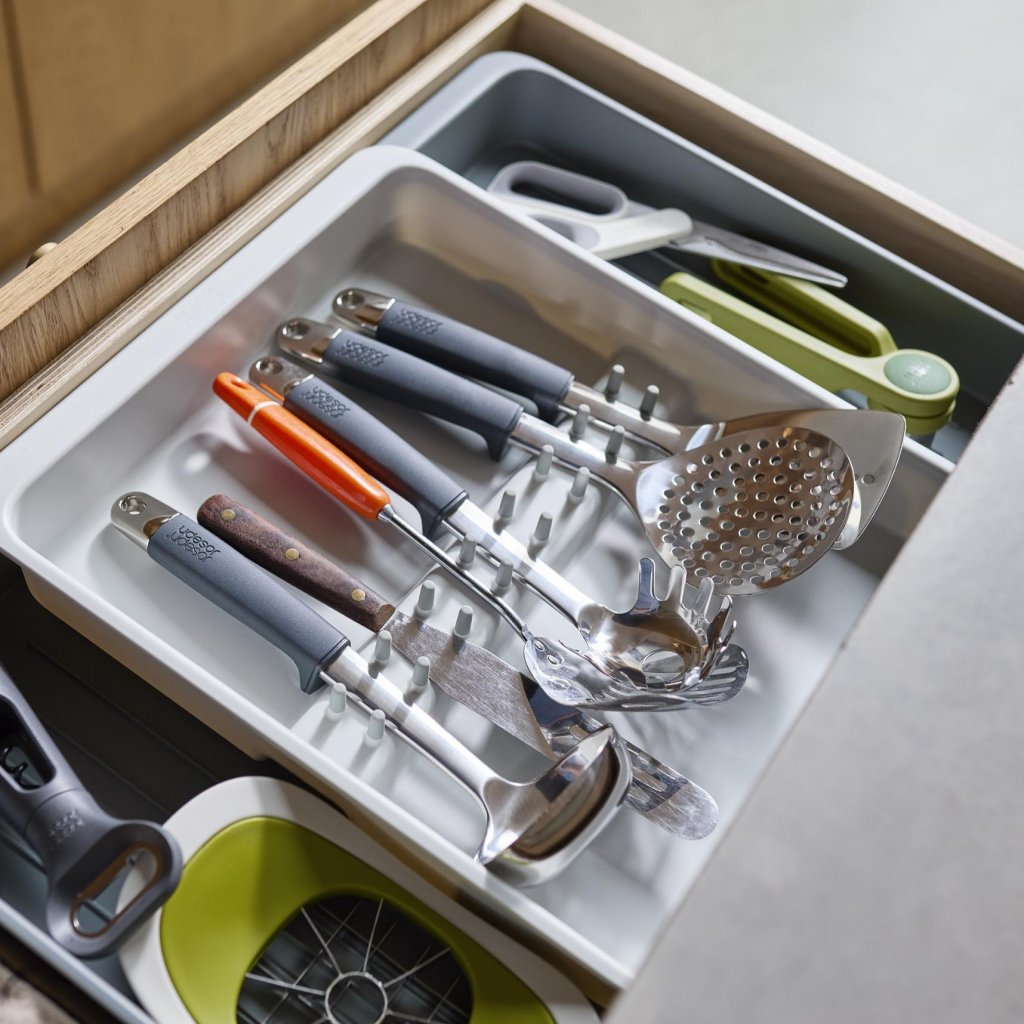 - Atvilktņu organizators Joseph Joseph DRAWERSTORE palīdz pārskatāmi sakārtot virtuves piederumi un piederumus atvilktnē.