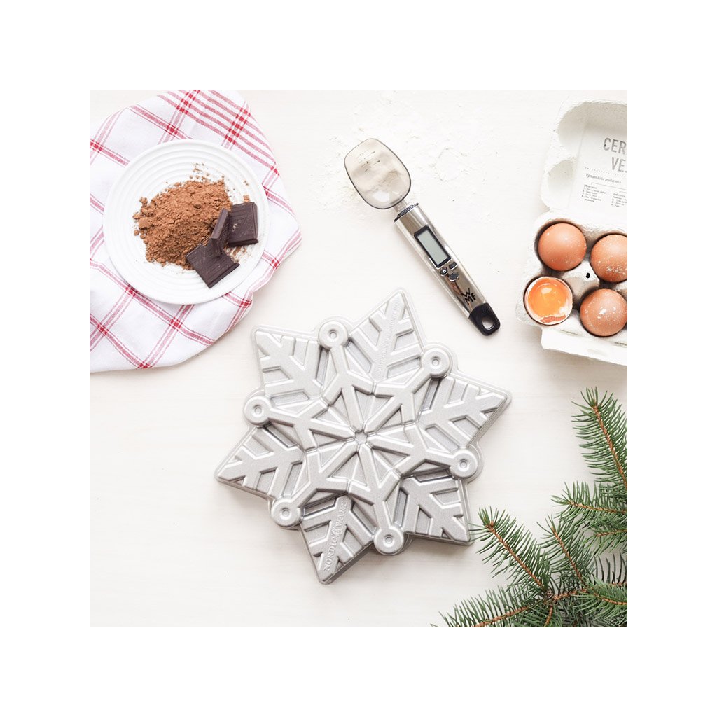 Amerikāņu zīmola Nordic Ware veidotā Frozen Snowflake Bundt® sudraba cepšanas forma no Holiday kolekcijas ir izgatavota no augstas kvalitātes masīva alumīnija ar nelīpošu pārklājumu. Biskvīta kūka vai kokosriekstu kūka kopā ar siltu kafiju sasildīs jūsu ķermeni un dvēseli ne tikai Ziemassvētkos, bet arī daudzos citos īpašos gadījumos. Pateicoties ģeometriskajai formai, kūku var viegli sagriezt 6 vai 12 vienādos gabalos.