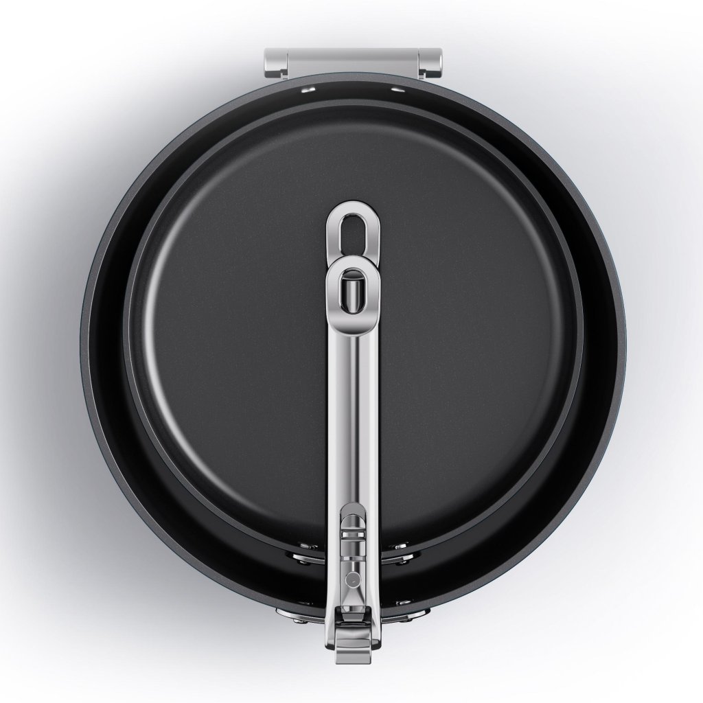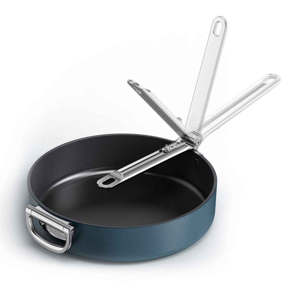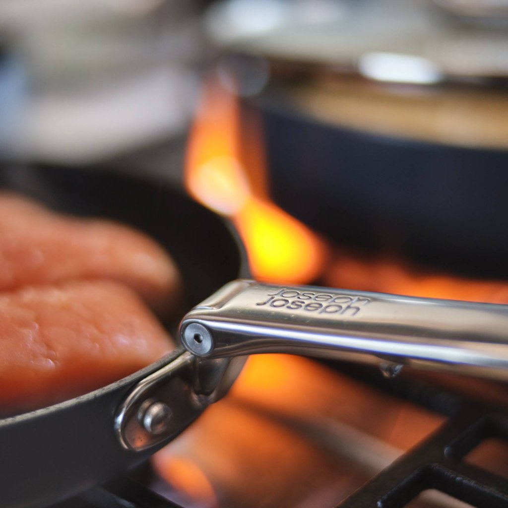 - Inovatīvais dizains ļauj nolocīt rokturus, kas, uzglabājot atvilktnēs vai skapīšos, ietaupa līdz pat 50% vietas salīdzinājumā ar parastajām pannām.