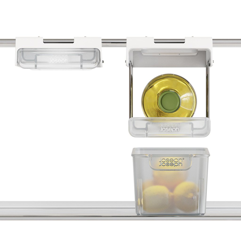 - Turētājs viegli un stingri tiek piestiprināts tieši zem ledusskapja plaukta, tādējādi izmantojot līdz šim neizmantoto telpu un palīdzot uzturēt ledusskapja iekšpusi perfekti organizētu.