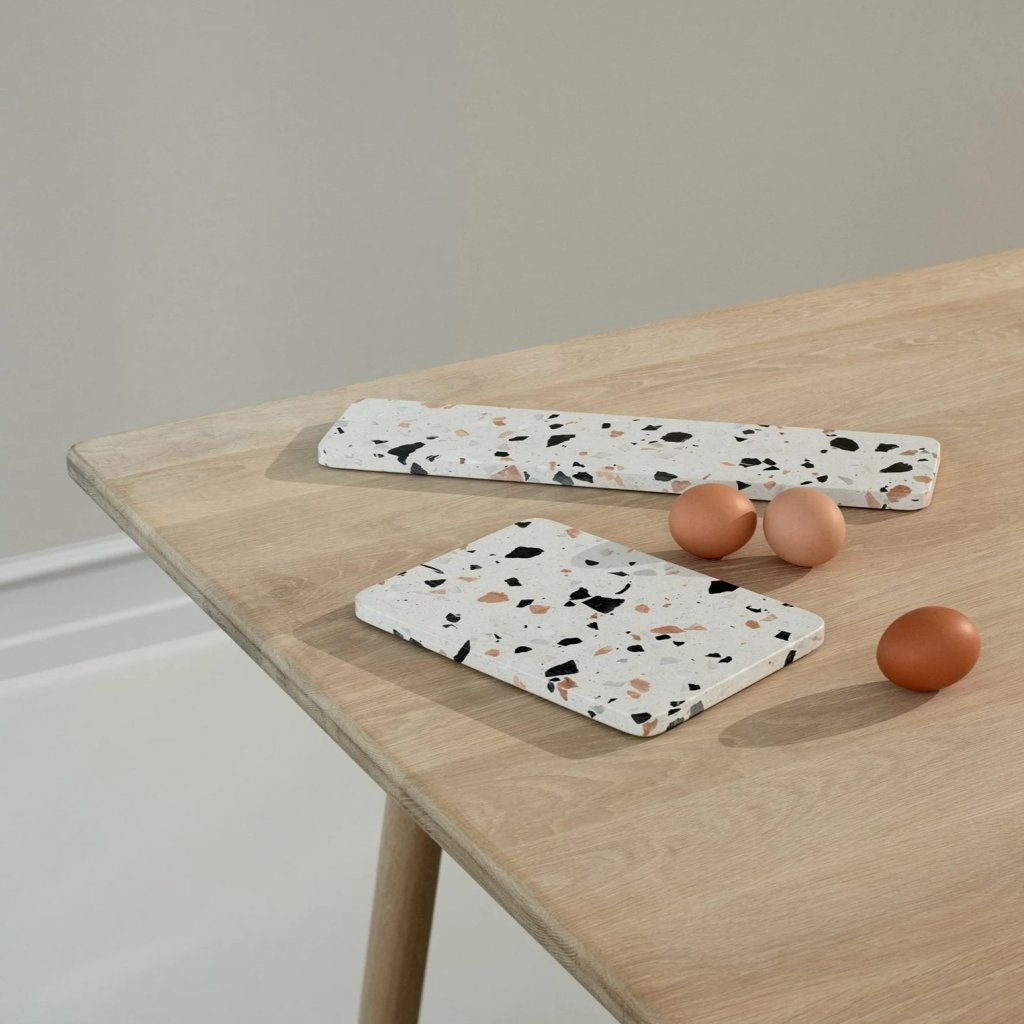 - izgatavots no terrazzo materiāla, kas, pateicoties krāsainajām detaļām, piešķir katram gabalam unikālu un dzīvīgu izskatu