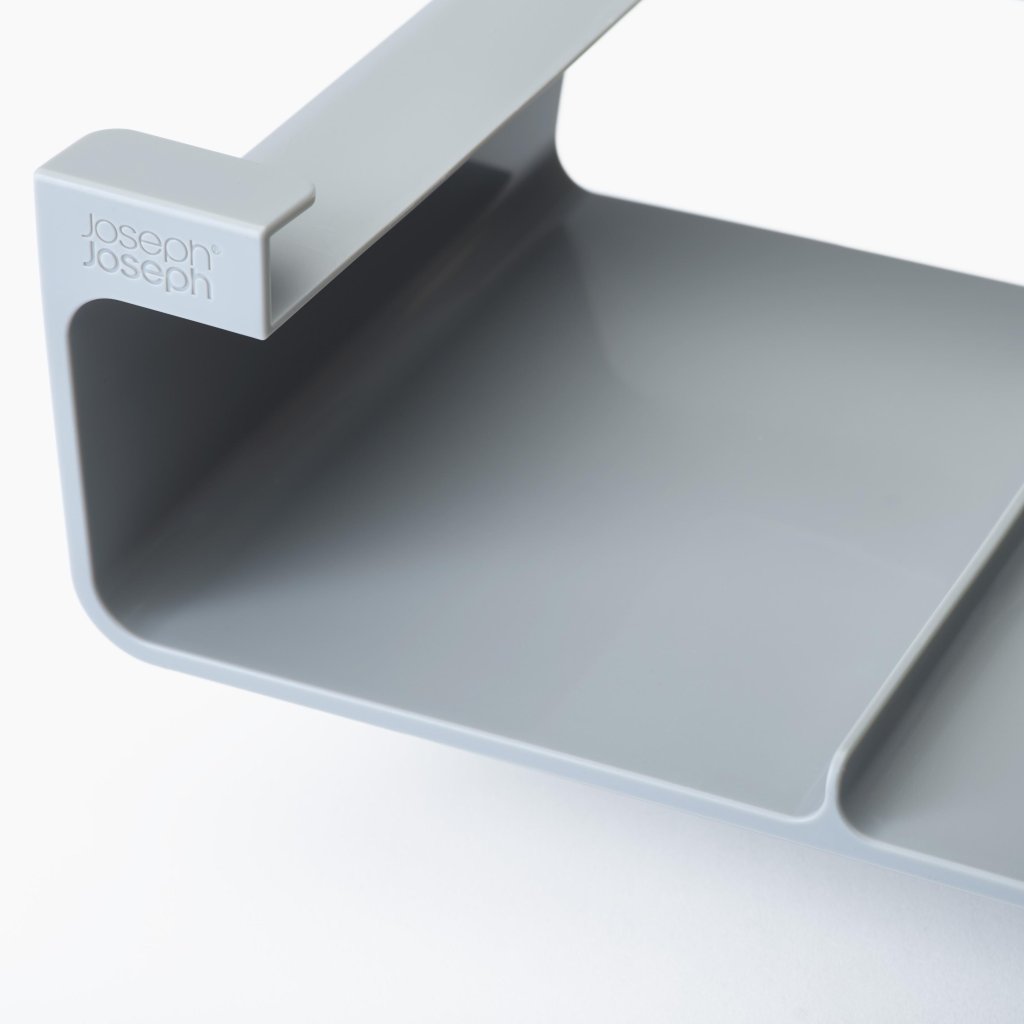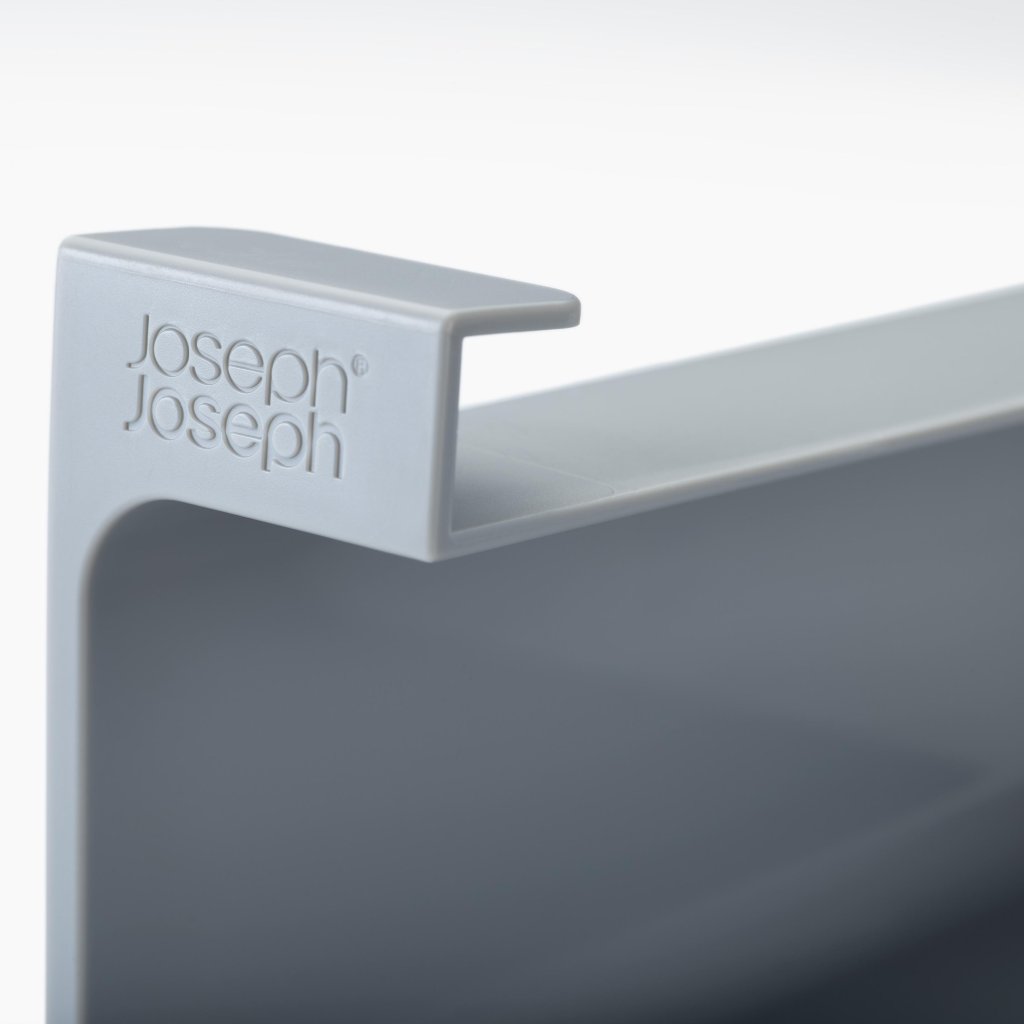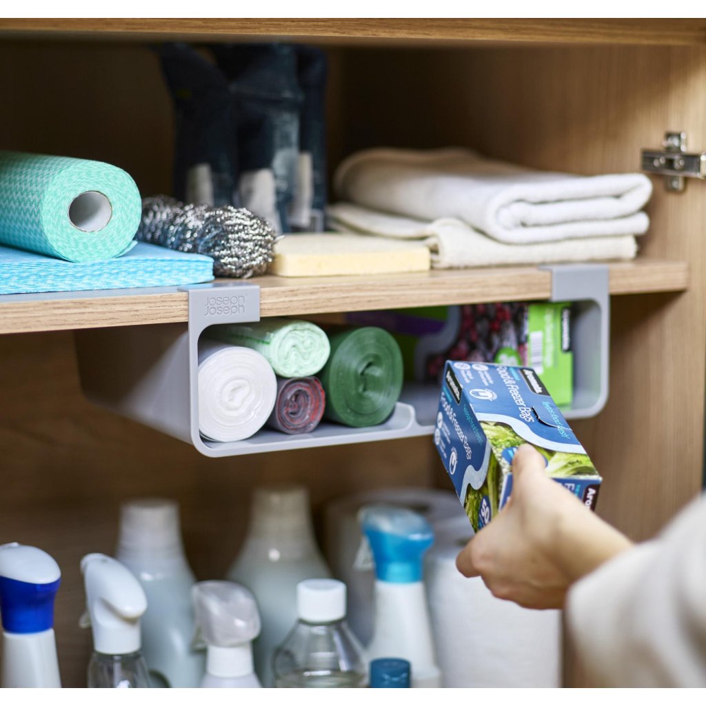 - Organizators Joseph Joseph CUPBOARDSTORE ļauj izmantot brīvo vietu zem virtuves skapja plaukta un rada praktisku vietu virtuves plēvju, folijas vai maisiņu uzglabāšanai.