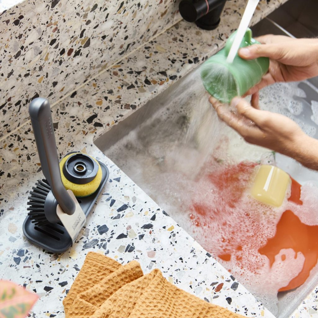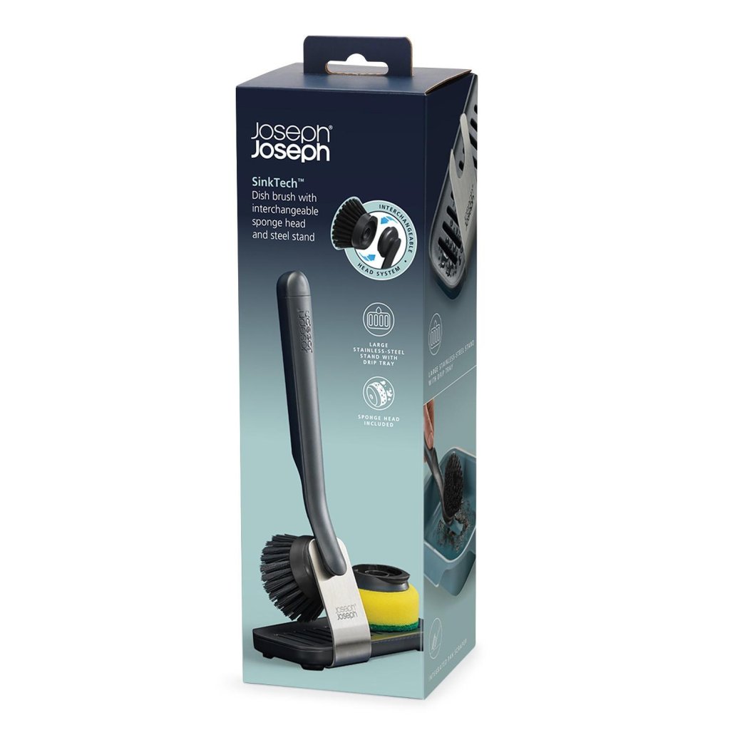 - Komplekts ar rotējošo birsti un sūkli ar statīvu SINKTECH pelēkā krāsā piedāvā visaptverošu risinājumu efektīvai trauku mazgāšanai un nevainojami sakārtotai telpai ap izlietni.
