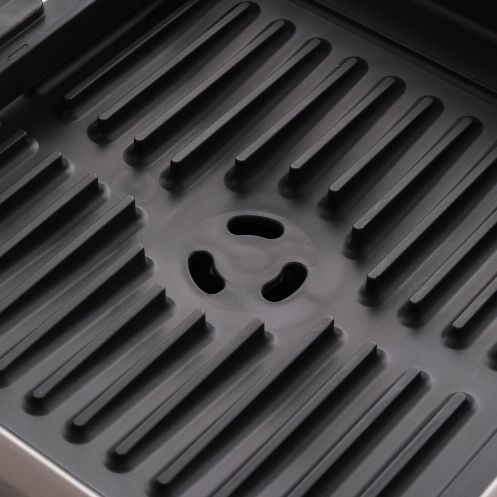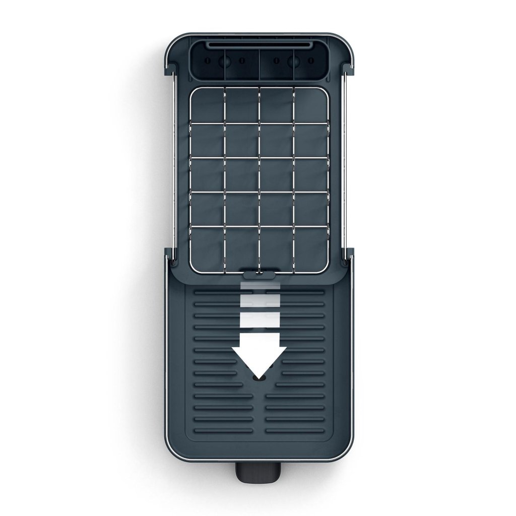 - Pēc trauku nosusināšanas izbīdāmo daļu var ieslidināt atpakaļ, tādējādi žāvētājs paliek kompakts un netraucē uz virtuves darba virsmas.