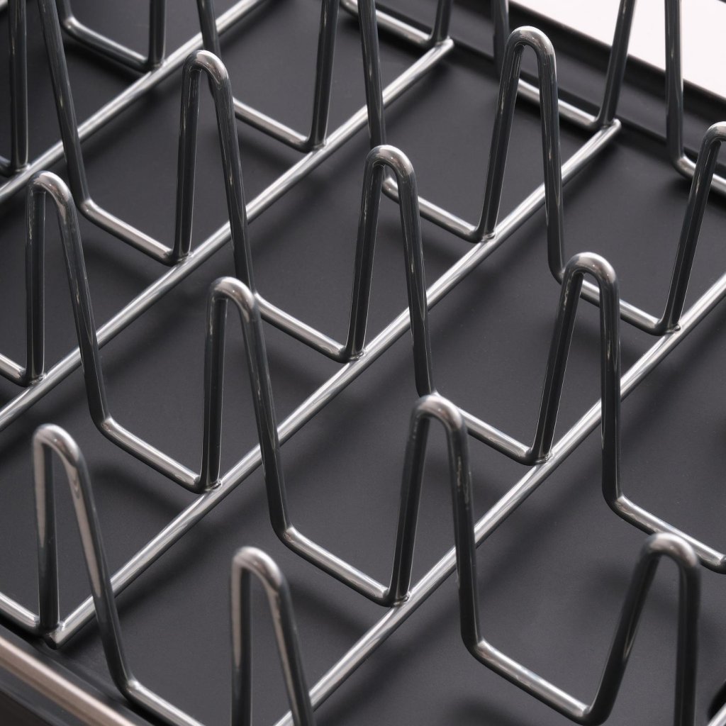 - Metāla turētāji šķīvjiem palīdz noturēt traukus stabili vietā un vienlaikus nodrošina efektīvu gaisa plūsmu žāvēšanas laikā.