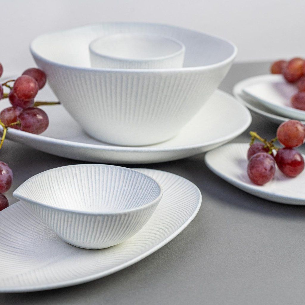 - Gravētas līnijas, kas stiepjas no šķīvja centra, rada smalku sala efektu, kas atdzīvojas gaismā un piešķir smalku vizuālo dziļumu katrai porcijai.