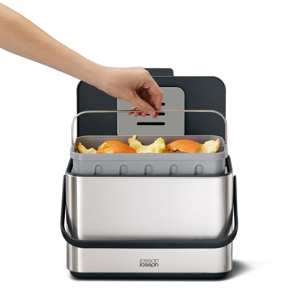 - Noņemamais iekšējais trauks ļauj viegli un higiēniski izmest saturu ārējā kompostētājā vai lielākā atkritumu tvertnē.
