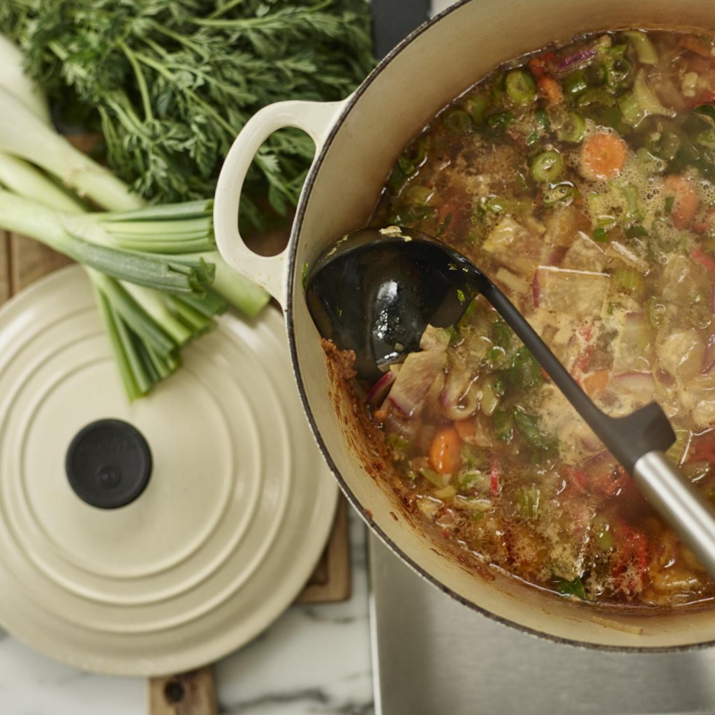 - Komplektā ietilpst pilna karote, karote ar caurumiem, pannas lāpstiņa, kauss un makaronu karote, lai gatavošanas laikā vienmēr būtu pa rokai pareizais instruments.