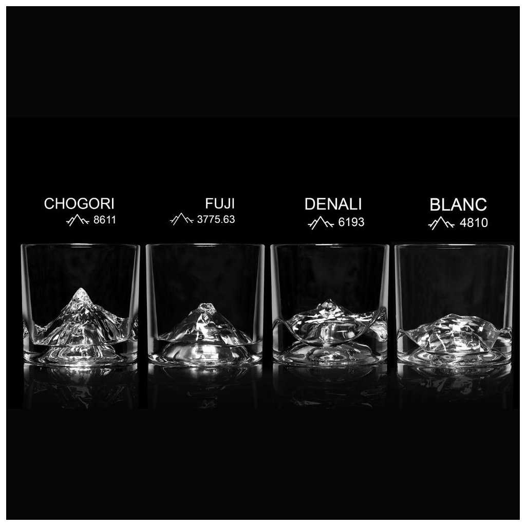 - 4 ar rokām darinātas glāzes: Mont Blanc, Denali, K2 un Fuji