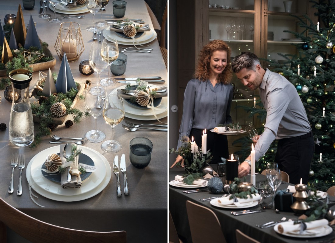 Ziemassvētku galds zilos un pelēkos toņos