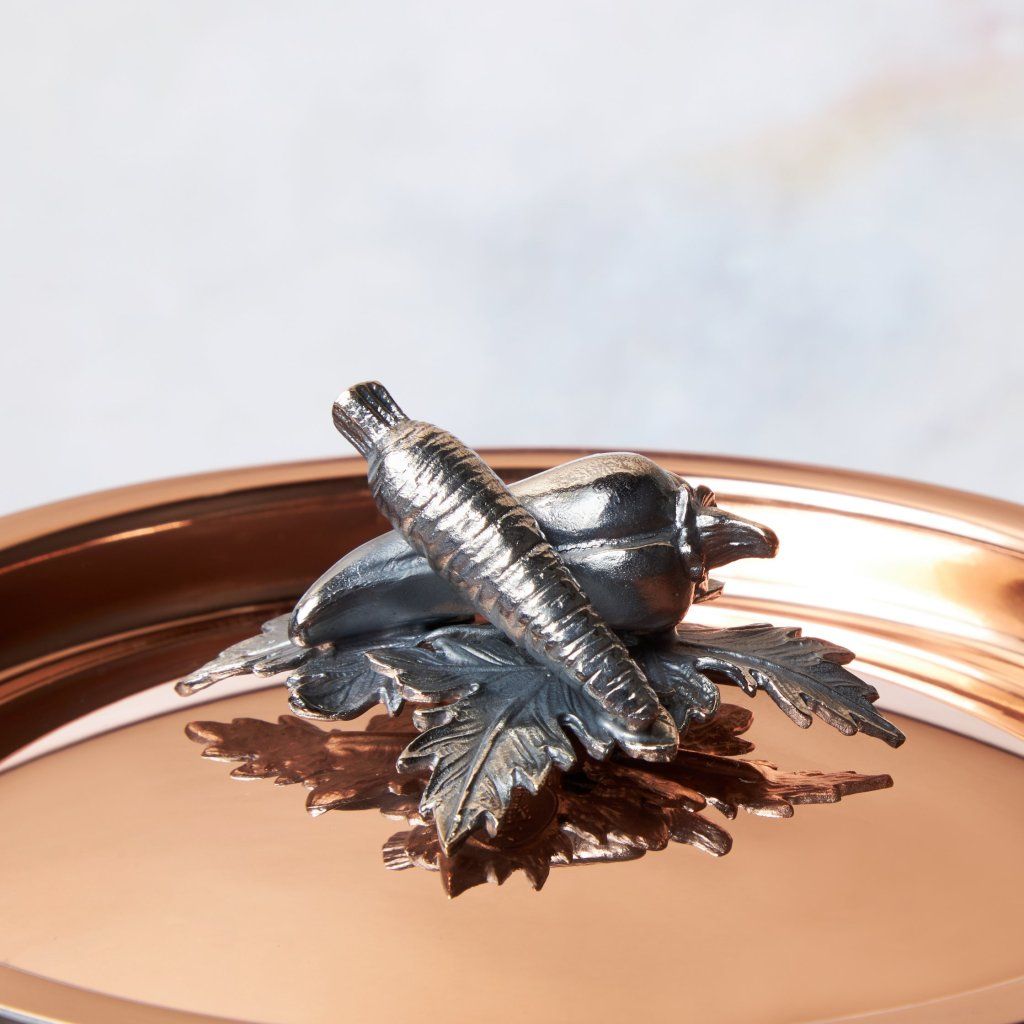 - ciets vara vāks ar rokturi ar skaistu dažādu dārzeņu dekoru, kas ir ar rokām liets no bronzas masīvkoka un apsudrabots