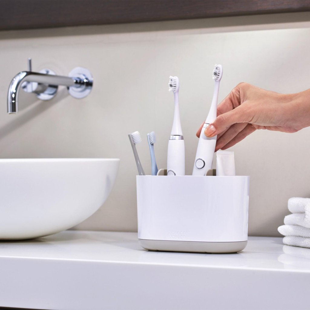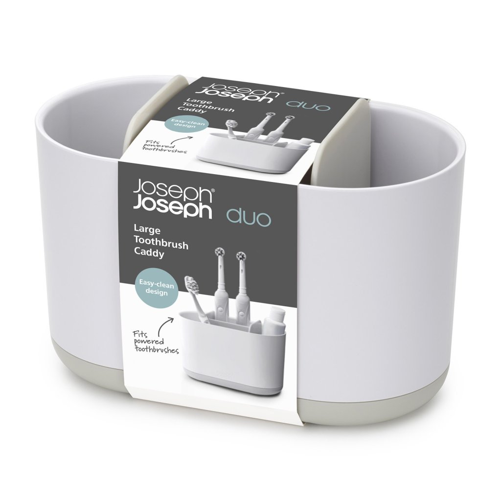 - Joseph Joseph DUO baltās krāsas zobu suku turētājs piedāvā paplašinātu uzglabāšanas vietu ikdienas higiēnas vajadzībām visai ģimenei.